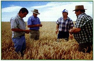 Interested observers (from left): Peter Irwin (Beaulieu), Alan Hardman (WA), Steve Blore (Balranald) and Choc Irwin (Beaulieu), inspect some of the record 62,000 tonne wheat crop at 'Milton Downs', Bellata, near Moree. All 50,000 acres had been prepared using Beaulieu R.U.M. Liquid Plant Food.