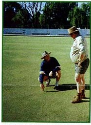 Head Green keeper Rod Brien (left) shows Choc Irwin one of his renovated greens From nought to high speed bowls surface in 4 weeks. That's the claim of Rod Brien, head green keeper at East Inverell Bowling Club. With a 500-strong membership, and regional competitions coming up in January, the challenge for Road and his staff was to complete the annual major renovation of the club's greens in about half the normal time. No cutting corners, though! The greens were tined, deep-drilled, scarified, top-dressed and fertilised. The secret was 2 litres of R.U.M. in 200L of water, applied to a green, twice in four weeks. "The greens ran at 15 seconds the first ball that was bowled", Rod said. "More importantly, a quick turn-around meant that members could get back on the greens that much sooner. And the committee didn't mind the extra revenue that it brought to the club either!", he smiled. A crack bowls player himself, Rod is a 15 year veteran of the green keepers art.