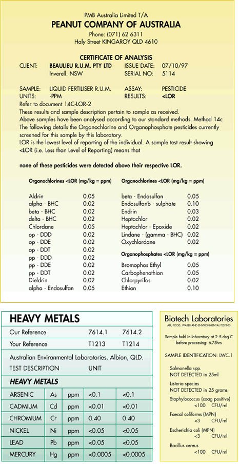 At 'Moore Park', Collingullie, west of Wagga, Ross Jolliffe and sons Greg and Keith, farm 2,800 acres of canola, wheat and lupins. Cattle and sheep are also in the mix. Ross has been a Beaulieu R.U.M. user for 3 years but when The R.U.M. Rebellion called on them recently, one of the first topics under discussion was the matter of heavy metals in their crop inputs. Details were required for their QA certificate. QA, or Quality Assurance, is now the name of the game. And it's causing farmers to look more closely at their own farm management practices. The Jolliffe's local grain buyers have embraced the HACCP Plan and so Ross made sure that both Greg and Keith attended the courses. Happily, we were able to furnish the boys with lab reports on R.U.M., not only for heavy metals (virtually none) but also for organophosphates/organochlorines (none) and the bacteria package of 'nasties', including salmonella, listeria, cereus, staph etc. (none). The lab reports are reproduced below. Keep 'em handy.