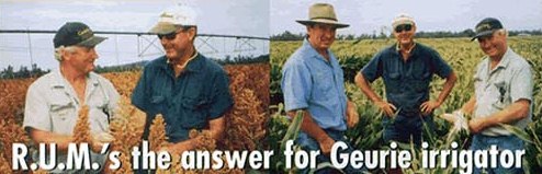 With 670-odd acres under pivot irrigation, Rod Stevenson and his fellow irrigators near Geurie, NSW, are hoping that recent encouraging rains continue. Their large cropping operations rely on water from the Macquarie River that in turn carries release from the Burrendong Dam. And the dam currently needs rain - lots of it. Rod has a 210 acre pivot watering his 'Bonus' sorghum. "This is our first season with R.U.M. and the good results so far will encourage us to look at other R.U.M. options like seed-dressing", Rod said. On 'Terra Bella', the long-held family property, Rod is also growing seed corn under contract to Pioneer. "They're out here twice a week monitoring the crop's progress. And they seem happy so far", said Rod's right-hand man, Graeme Delany. "Rod's pretty open to new ideas in plant nutrition and that's starting to come through with the R.U.M.-treated crops."