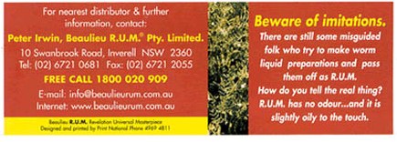 The Fine Print: The information in this newsletter is published in good faith without making or implying any warranty as to its accuracy or otherwise. It is based on interviews and other material believed by Beaulieu R.U.M. Pty. Ltd. to be accurate at the time of publication. Every person must make up their own mind as to the suitability of the products or materials referred to herein and do so at their own risk. Beaulieu R.U.M. Pty. Ltd. shall not be liable for any loss, injury, or damage or death as a result of negligence or misuse of any product or information herein provided. Permission to reproduce, copy or transmit any part of this work will not be unreasonably withheld if you just ask first.